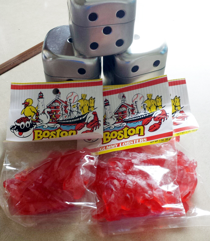 The Syme family got a gift in the mail this morning all the way from sunny Las Vegas by way of Boston Harbour and then back to England.  Within its cardboard walls the package contained three bags of bright red (the kind of red that only American candy customers get as those ‘e’ numbers are banned in the EU) Gummy Lobsters along with three silver metal dice.  Each of these dice filled with delicious Salt Water Taffy (something else that you cannot get with any ease in the UK).  Very kind to send these things in three’s it means that the three little Symes will not have to duel to the death over a share.
